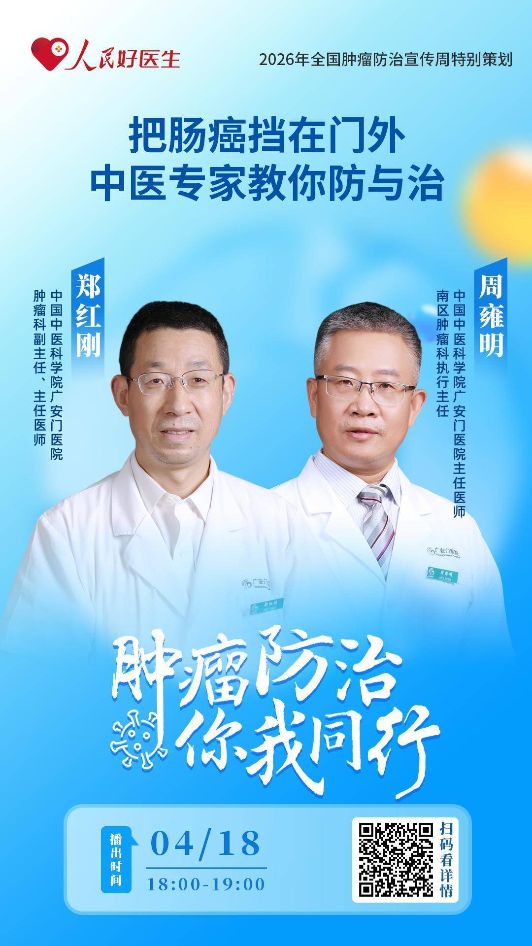 近年来,大家对肠癌的防治也越来越关注。肠癌并非不治之症,早发现、早治疗,癌症也可以治愈。中医在肠癌早期筛查、高危人群干预中能发挥哪些作用?中医药对肠癌患者有哪些核心益处?4月18日(周六)18:00-19:00,中国中医科学院广安门医院肿瘤科副主任、主任医师郑红刚,中国中医科学院广安门医院主任医师、南区肿瘤科执行主任周雍明将做客“人民好医生”客户端直播间,与大家分享“中医药如何防治肠癌”的相关内容。