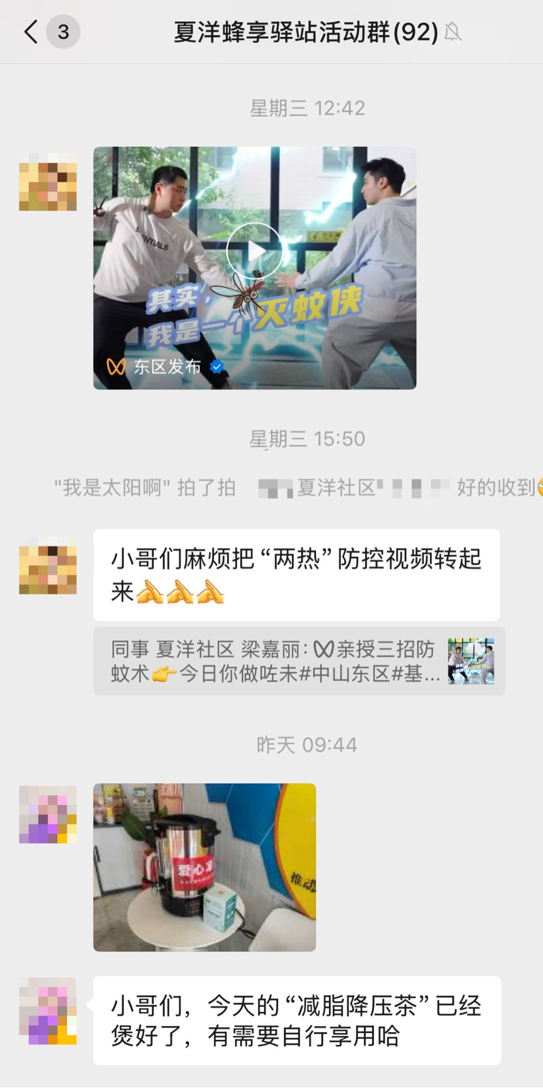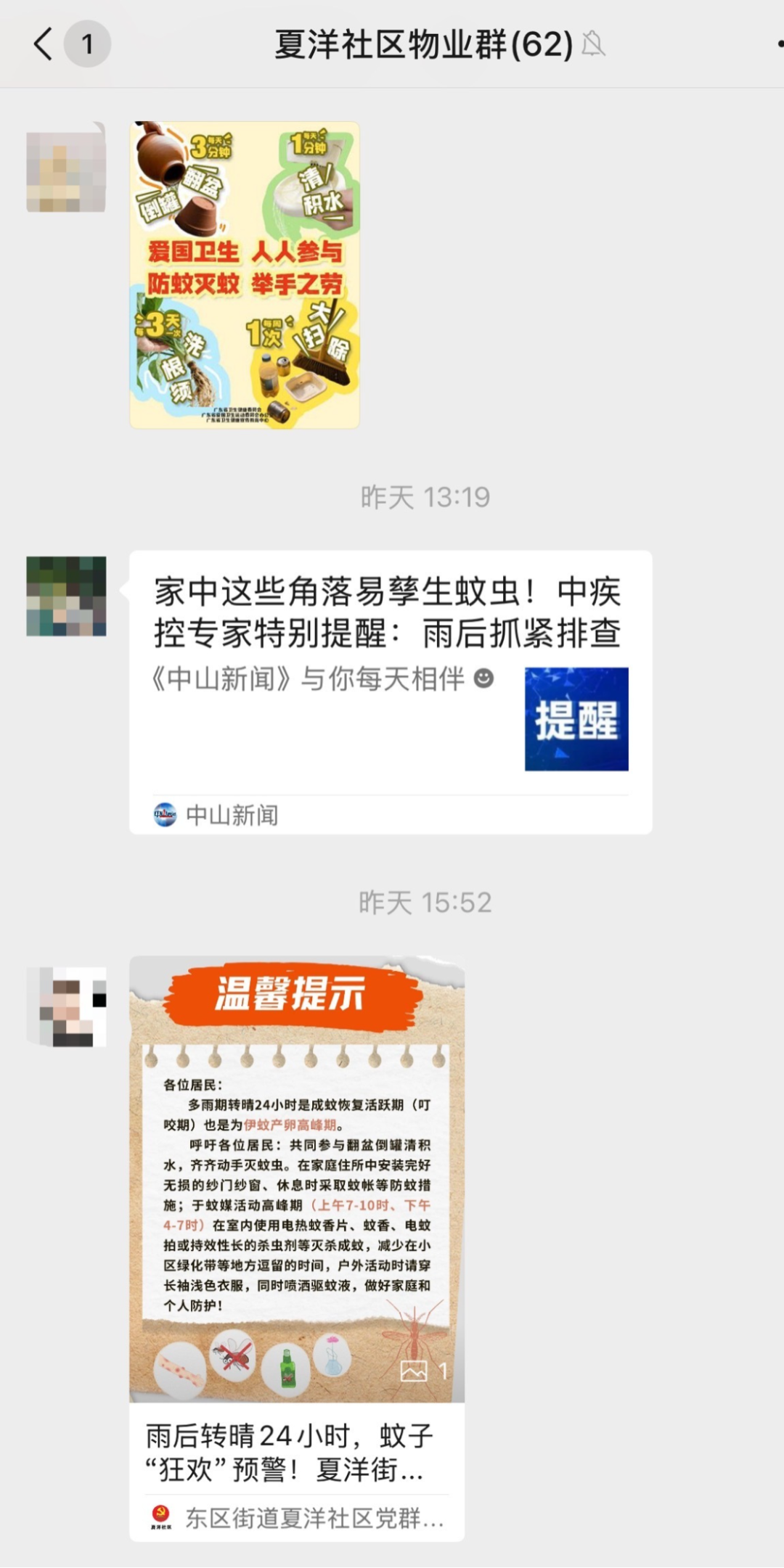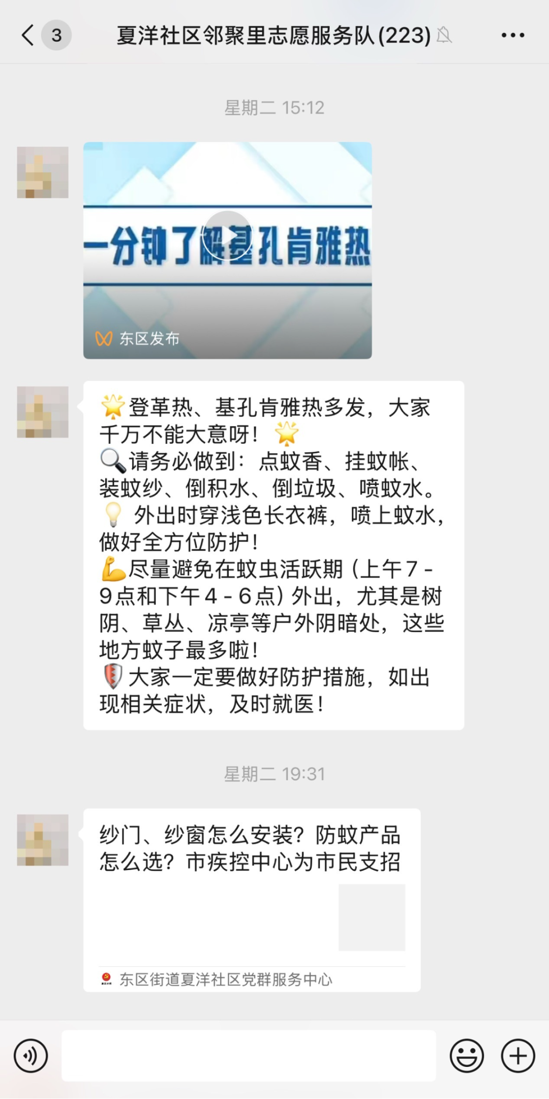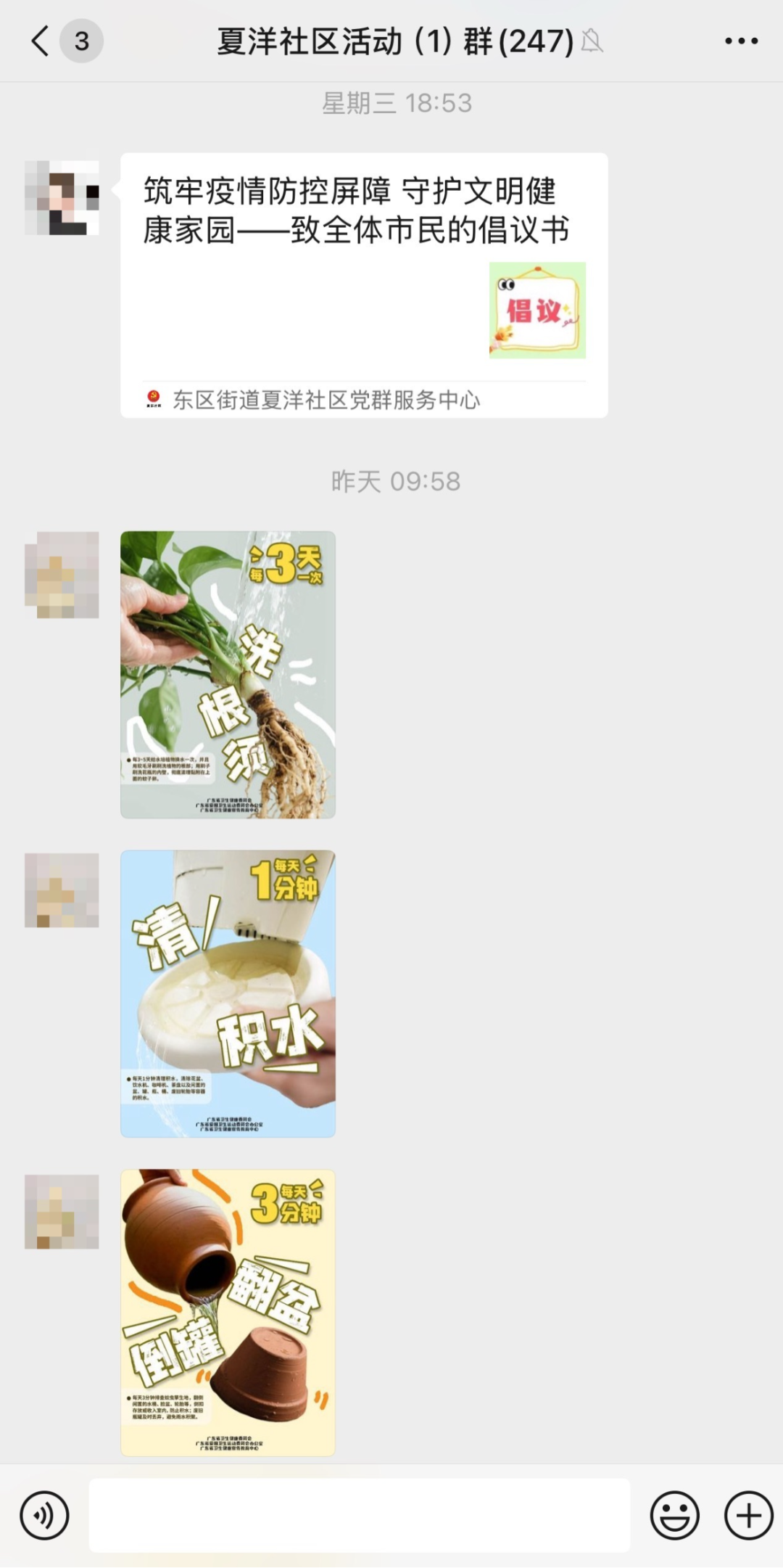 在线下防控宣传工作如火如荼的同时,夏洋社区同步织密线上“科普网”,确保科学防蚊要点穿透“最后一米”,直达千家万户。每天通过微信公众号及社区各微信群、朋友圈等开展线上宣传,推送《致居民朋友们的一份倡议书》、“两热”防控科普图文、创意短视频和海报。指尖轻点间,防控知识“飞入寻常百姓家”,实现精准化、常态化传播。